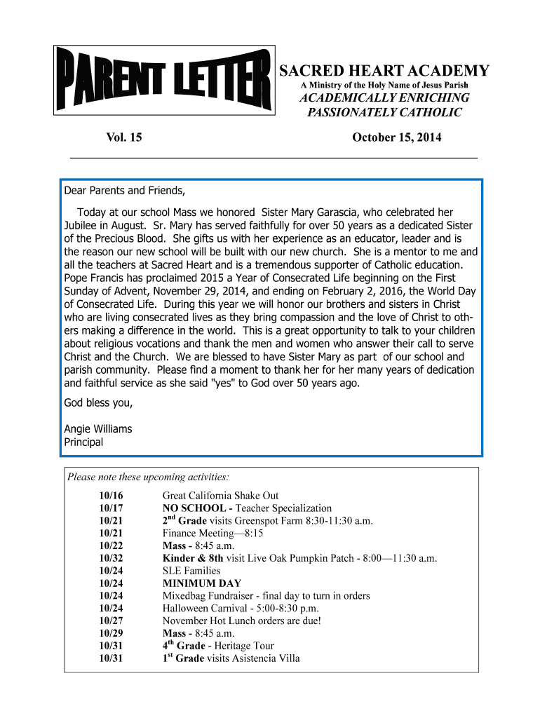 SACRED HEART ACADEMY A Ministry of the Holy Name of Jesus ParishACADEMICALLY ENRICHING PASSIONATELY CATHOLIC Vol. 15 October 15, 2014, Dear Parents and Friends, Today at our school Mass we honored