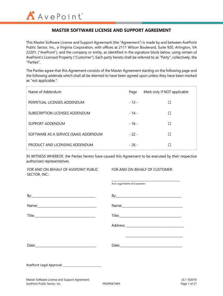 Get the free Master Software License and Support Agreement (US)(Public Sector)(form)(v 3.1 102019...