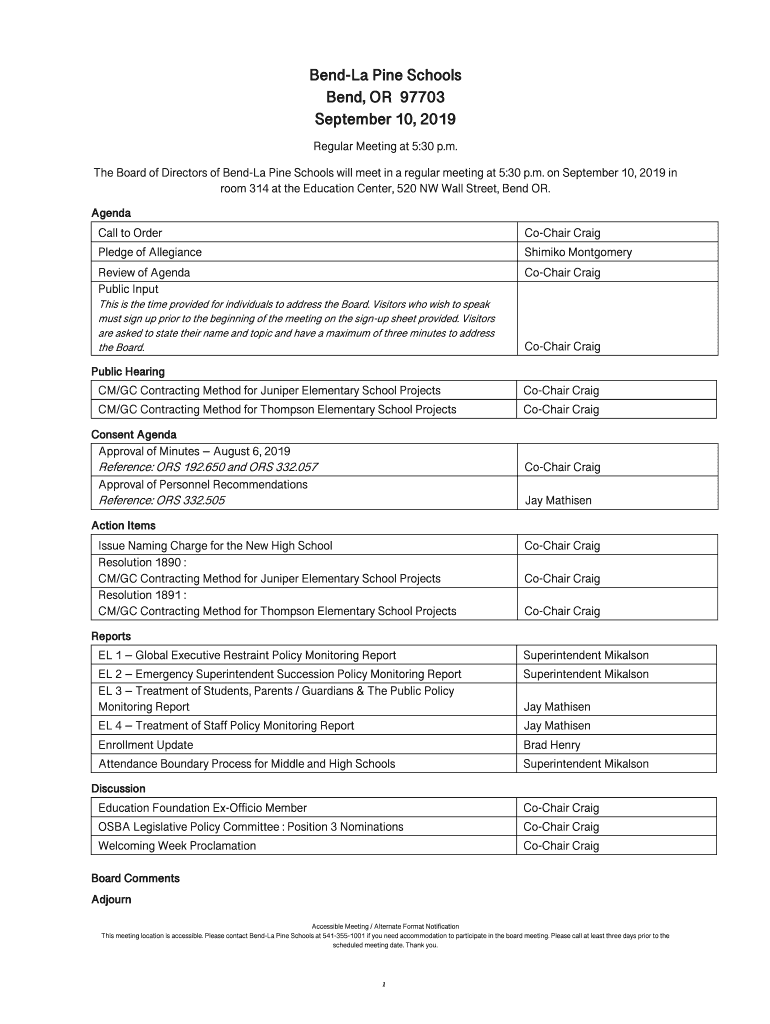 The Board of Directors of Bend La Pine Schools will meet in a regular meeting at 5:30 p.m. on September 10, 2019,