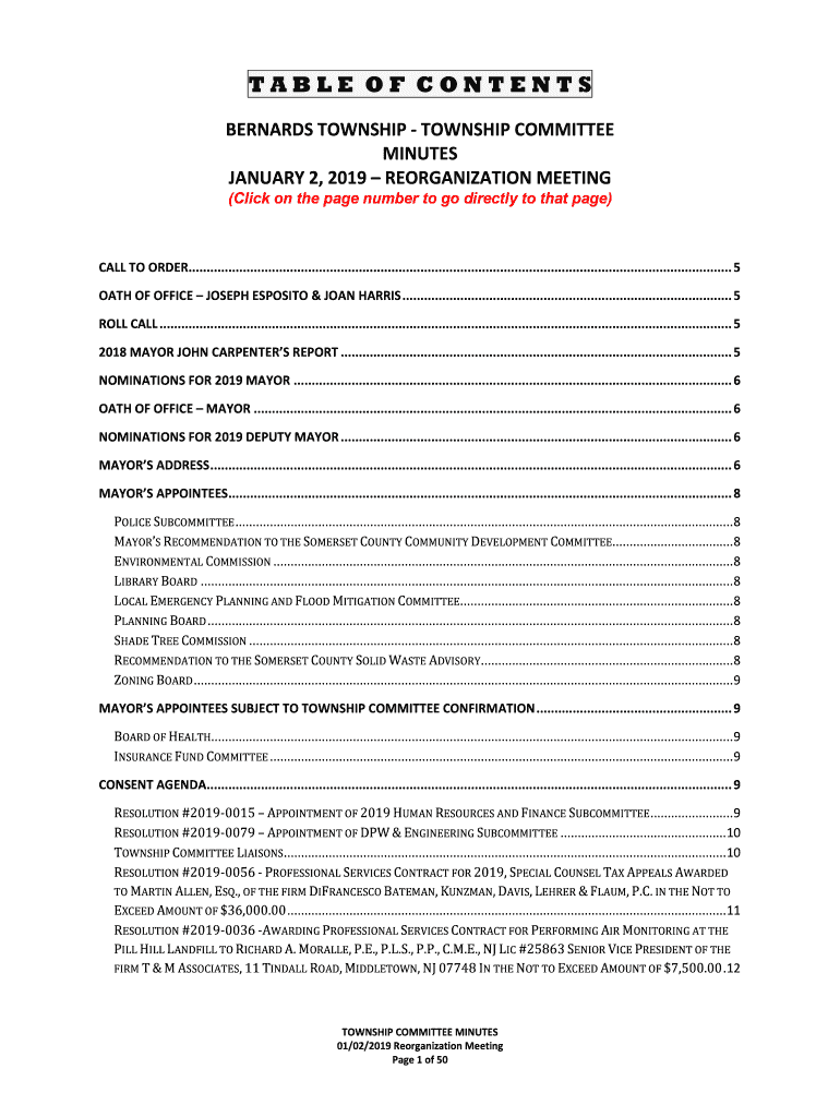 TABLE OF CONTENTS BERNARD TOWNSHIP COMMITTEE MINUTES JANUARY 2, 2019, REORGANIZATION MEETING (Click on the page number to go directly to that page)CALL TO ORDER......................................................................................................................................................