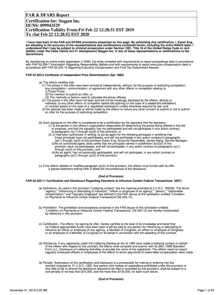 FAR & DEARS Report Certification for: Seq gen Inc. DUNS: 099943529 Certification Validity From:Fri Feb 22 12:28:51 EST 2019 To :Sat Feb 22 12:28:52 EST 2020 I have read each of the FAR and DEARS provisions