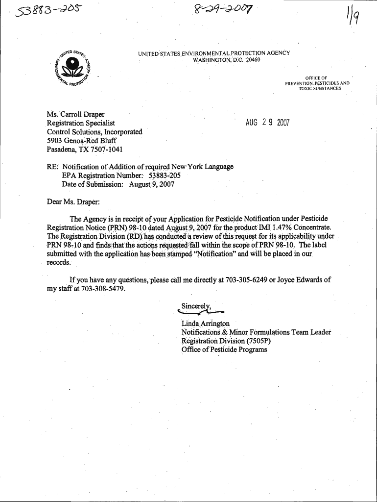 I) 9 UNITED STATES ENVIRONMENT.PROTECTION AGENCY '. '. . . . , Within(iron; 'o:C. 20460OFFICE OF PREVENTION: PESTICIDES AND TOXIC SUBSTANCES Ms. Carroll Draper Registration Specialist Control Solutions,