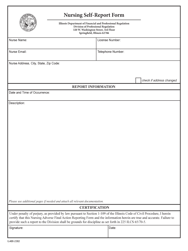All nurses who are licensed and practicing are required to file a nursing self-report form when necessary.