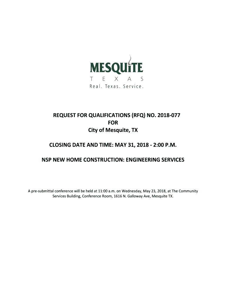 REQUESTFORQUALIFICATIONS(RFQ)NO.2018077 FOR CityofMesquite, TX CLOSINGDATEANDTIME:MAY31,20182:00P. M. NSPNEWHOMECONSTRUCTION:ENGINEERINGSERVICES Apresubmittalconferencewillbeheldat11:00a.m.on Wednesday,May23,2018,atTheCommunity