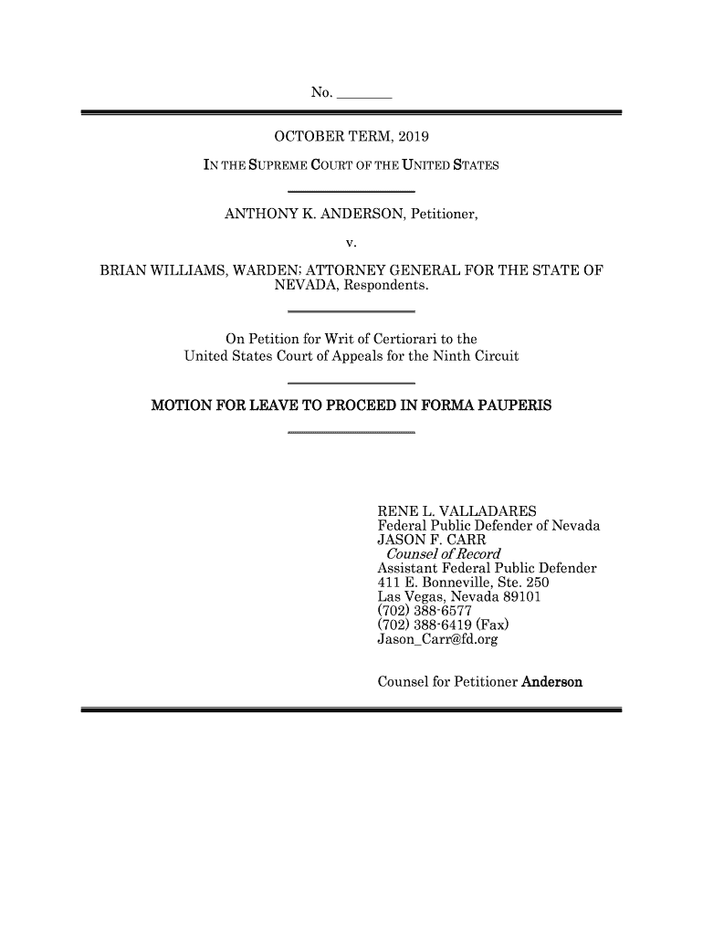 No. OCTOBER TERM, 2019 IN THE SUPREME COURT OF THE UNITED STATES ANTHONY K. ANDERSON, Petitioner, v. BRIAN WILLIAMS, WARDEN; ATTORNEY GENERAL FOR THE STATE OF NEVADA, Respondents. On Petition for