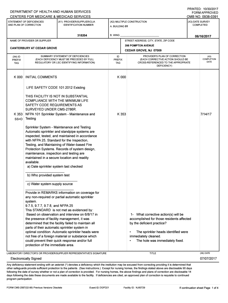 PRINTED: 10/30/2017 FORM APPROVEDDEPARTMENT OF HEALTH AND HUMAN SERVICES CENTERS FOR MEDICARE & MEDICAID SERVICES STATEMENT OF DEFICIENCIES AND PLAN OF CORRECTION(X1) PROVIDER/SUPPLIER/CIA IDENTIFICATION