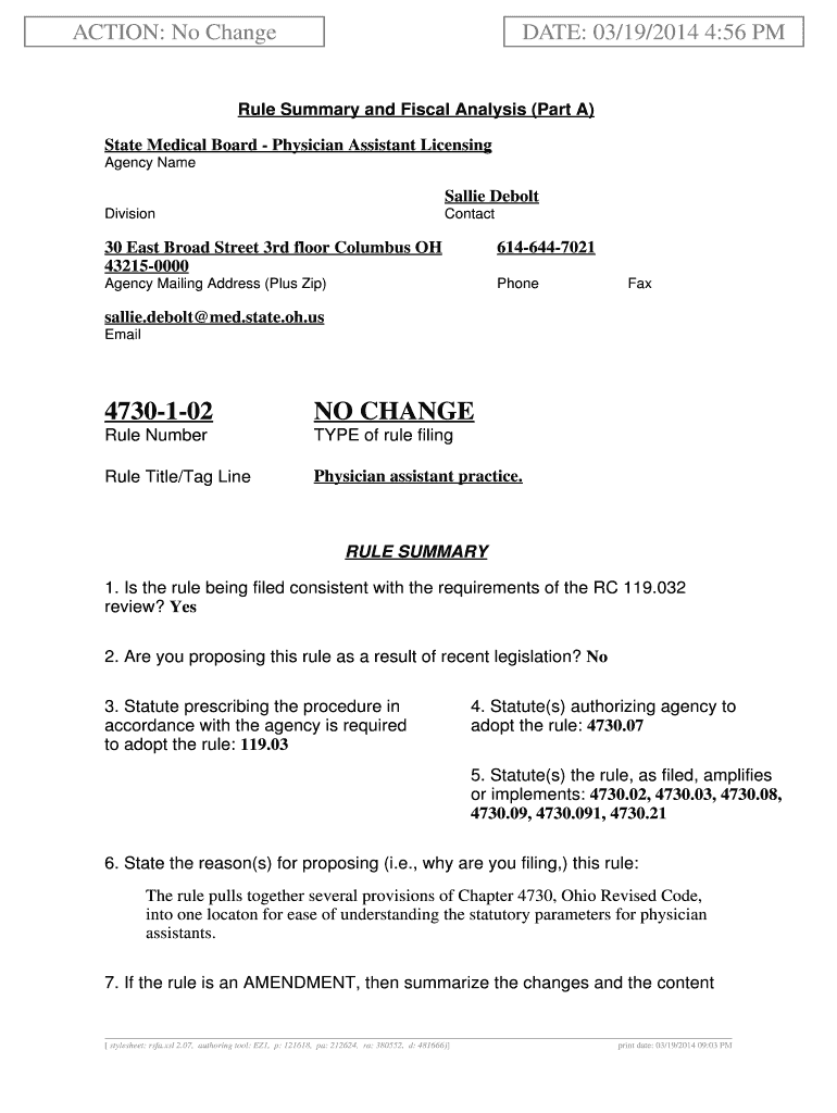 ACTION: No Change DATE: 03/19/2014 4:56 Rule Summary and Fiscal Analysis (Part A) State Medical Board Physician Assistant Licensing Agency Name Sallie Debut DivisionContact30 East Broad Street 3rd