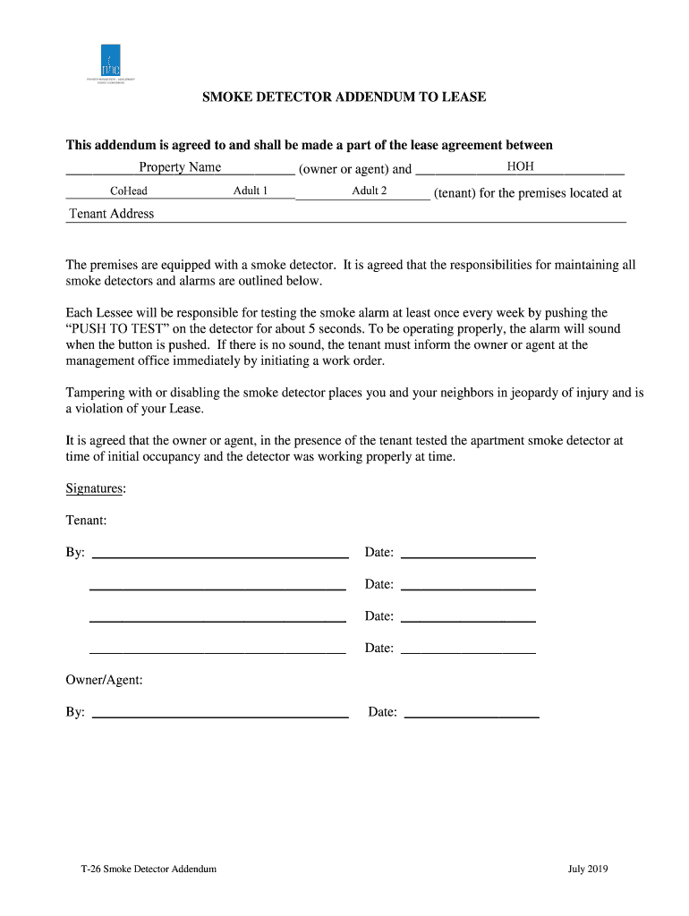 SMOKE DETECTOR ADDENDUM TO Leases addendum is agreed to and shall be made a part of the lease agreement between HOW Property Name (owner or agent) and Adult 1 Adult 2 Colead (tenant) for the premises