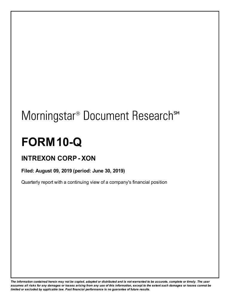 Morningstar Document Research FORM 10Q INTRON CORP ON Filed: August 09, 2019 (period: June 30, 2019) Quarterly report with a continuing view of a company's financial position information contained