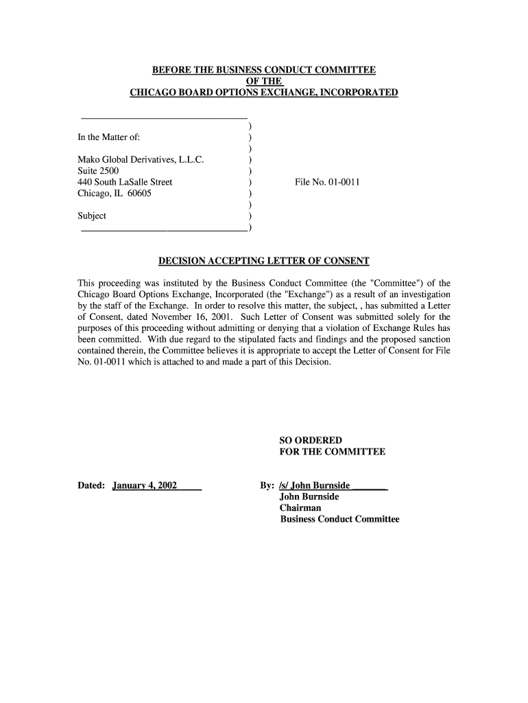 BEFORE THE BUSINESS CONDUCT COMMITTEE OF THE CHICAGO BOARD OPTIONS EXCHANGE, INCORPORATED))) Make Global Derivatives, L.L.C.) Suite 2500) 440 South Basally Street) Chicago, IL 60605)) Subject)) In
