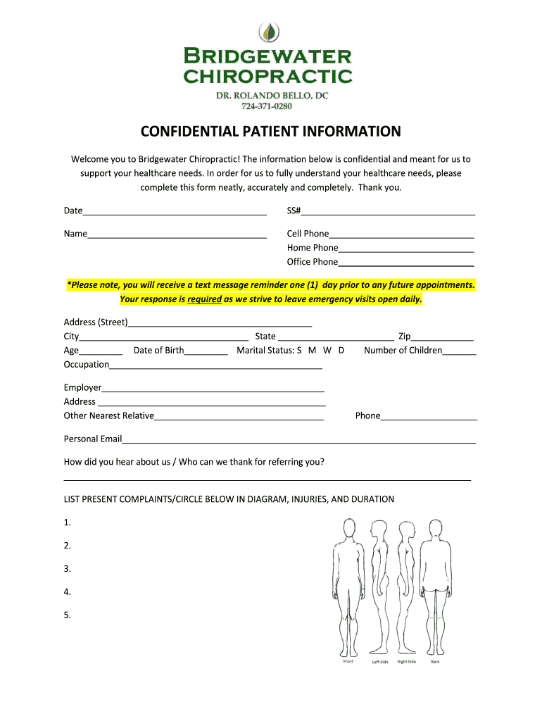 CONFIDENTIAL PATIENT INFORMATION Welcome you to Bridgewater Chiropractic! The information below is confidential and meant for us to support your healthcare needs. In order for us to fully understand