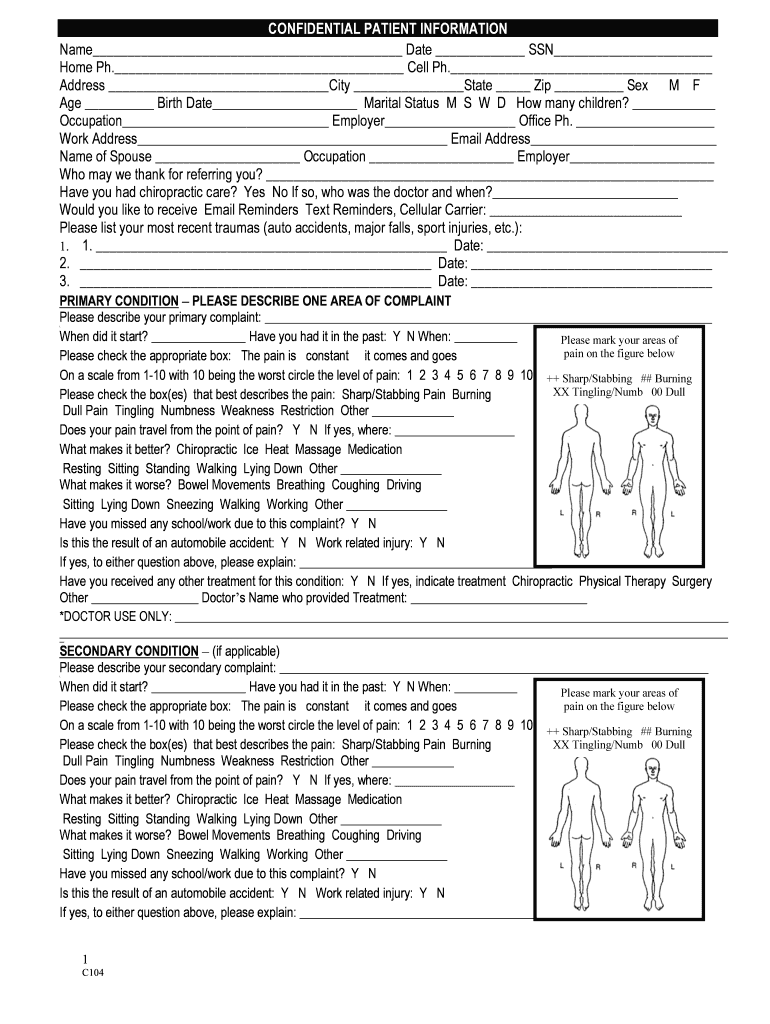 CONFIDENTIAL PATIENT INFORMATION Name Date SSN Home pH. Cell pH. Address City State Zip Sex M F Age Birth Date Marital Status M S W D How many children? Occupation Employer Office pH. Work Address