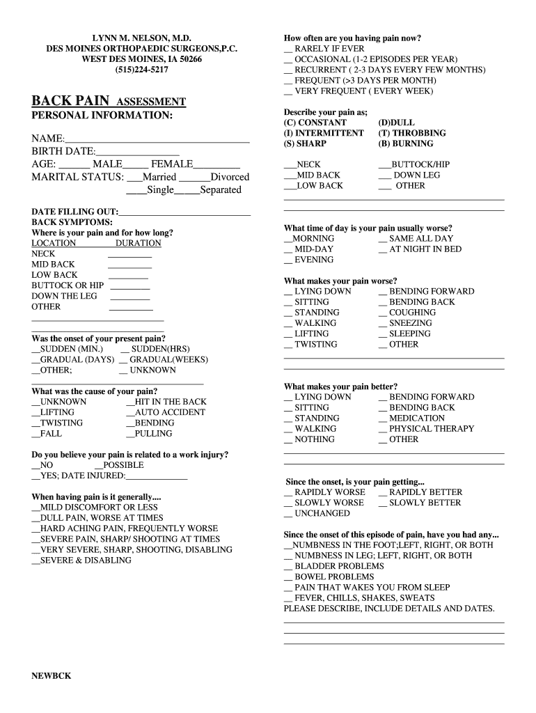 LYNN M. NELSON, M.D. DES MOINES Orthopedic SURGEONS, P.C. WEST DES MOINES, IA 50266 (515)2245217BACK PRE-ASSESSMENT PERSONAL INFORMATION: NAME: BIRTH DATE: AGE: MALE FEMALE MARITAL STATUS: Married