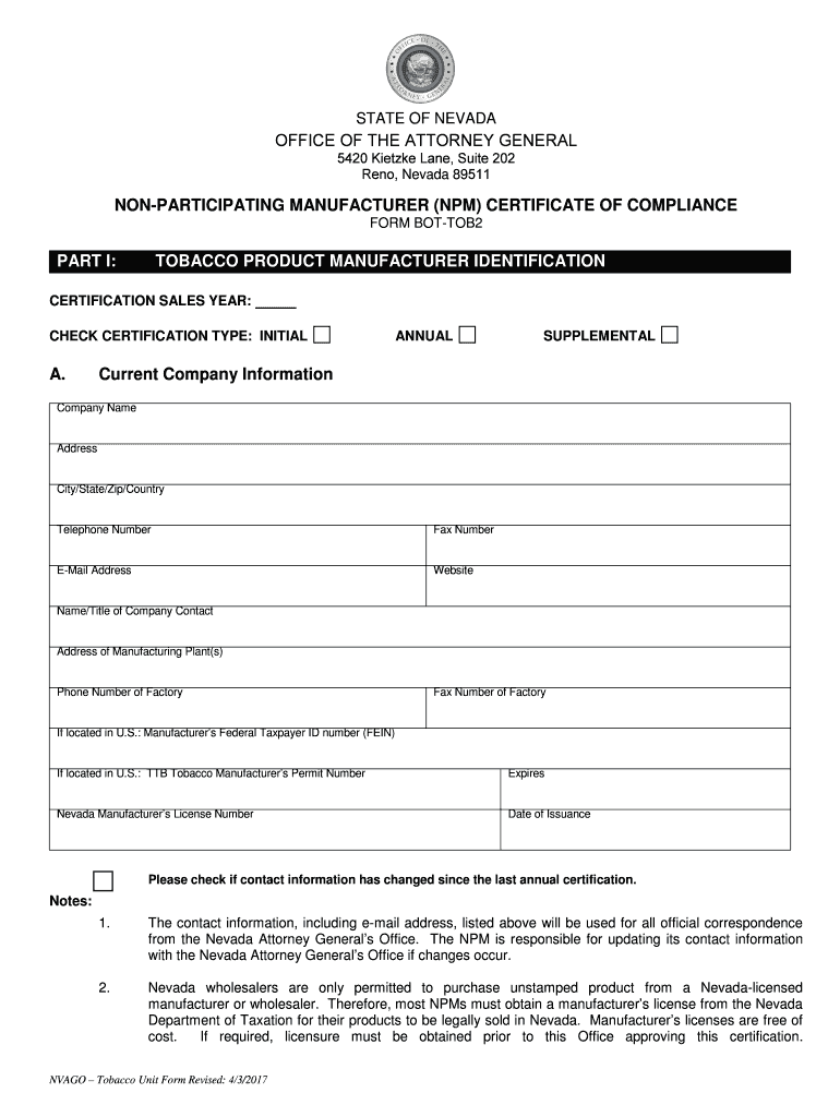 Reno, Nevada 89511NONPARTICIPATING MANUFACTURER (NPM) CERTIFICATE OF COMPLIANCE