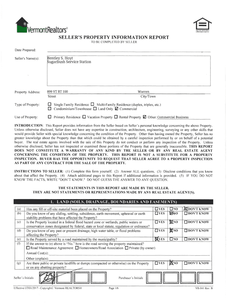 To SELLER IS PROPERTY INFORMATION REPORT TO BE COMPLETED BY SE LEER Date Prepared : Seller's Name(s):Property Address:! Ben they S. Host UGA rbushService Station899 VT RT 100Warren City/Downstream