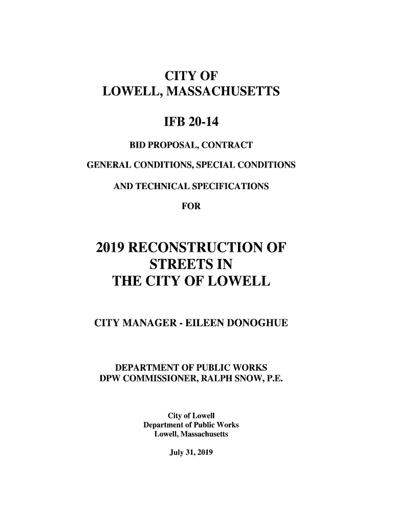 CITY OF LOWELL, MASSACHUSETTS IF 2014 BID PROPOSAL, CONTRACT GENERAL CONDITIONS, SPECIAL CONDITIONS AND TECHNICAL SPECIFICATIONS FOR2019 RECONSTRUCTION OF STREETS IN THE CITY OF LOWELL CITY MANAGER