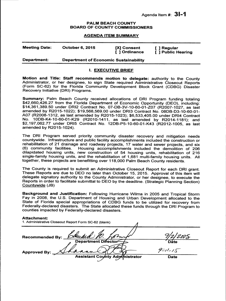 Agenda Item #:311PALM BEACH COUNTY BOARD OF COUNTY COMMISSIONERS AGENDA ITEM SUMMARY Meeting Date:October 6, 2015Department:Department of Economic Sustainability X Consent Ordinance Regular Public