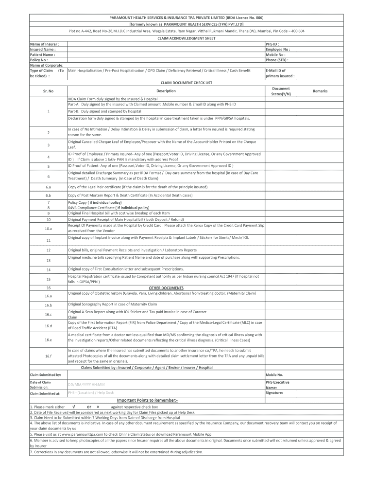 PARAMOUNT HEALTH SERVICES & INSURANCE TPA PRIVATE LIMITED (IRA License No. 006) formerly known as PARAMOUNT HEALTH SERVICES (TPA) PVT.LTD Plot no. A442, Road No28,M.I.D.C Industrial Area, Waggle Estate,