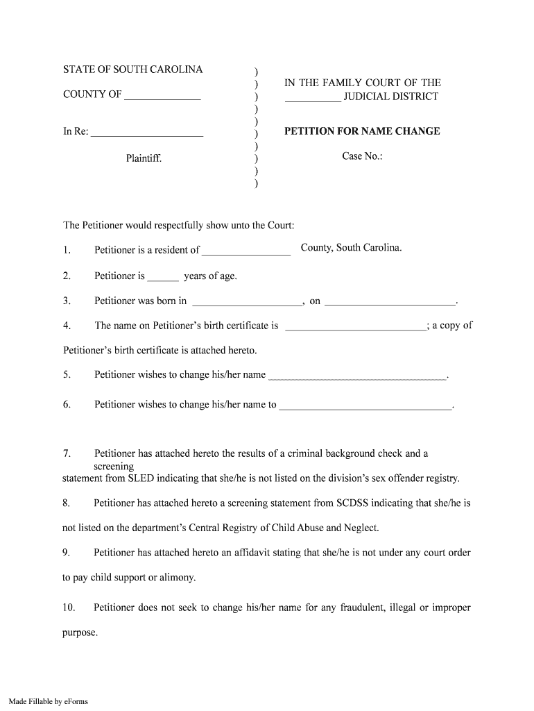 STATE OF SOUTH CAROLINA COUNTY OF In Re: Plaintiff.) )))))))))IN THE FAMILY COURT OF THE JUDICIAL DISTRICT PETITION FOR NAME CHANGE Case No.:The Petitioner would respectfully show unto the Court: