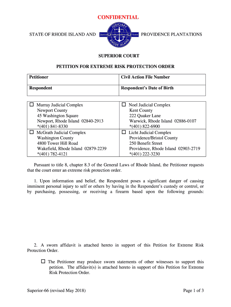 CONFIDENTIAL STATE OF RHODE ISLAND PROVIDENCE PLANTATIONSSUPERIOR COURT PETITION FOR EXTREME RISK PROTECTION ORDER PetitionerCivil Action File NumberRespondentRespondents Date of Birth Murray Judicial