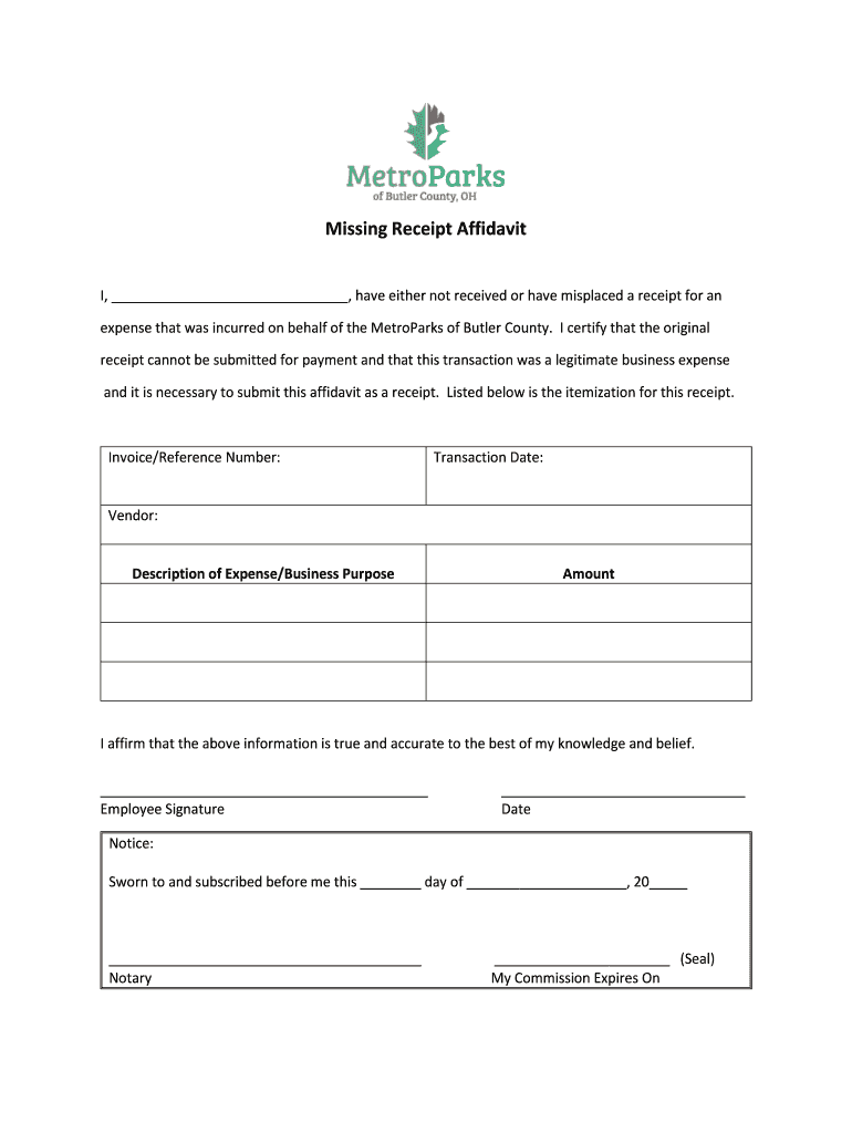 Missing Receipt Affidavit I, have either not received or have misplaced a receipt for an expense that was incurred on behalf of the Metro Parks of Butler County. I certify that the original receipt