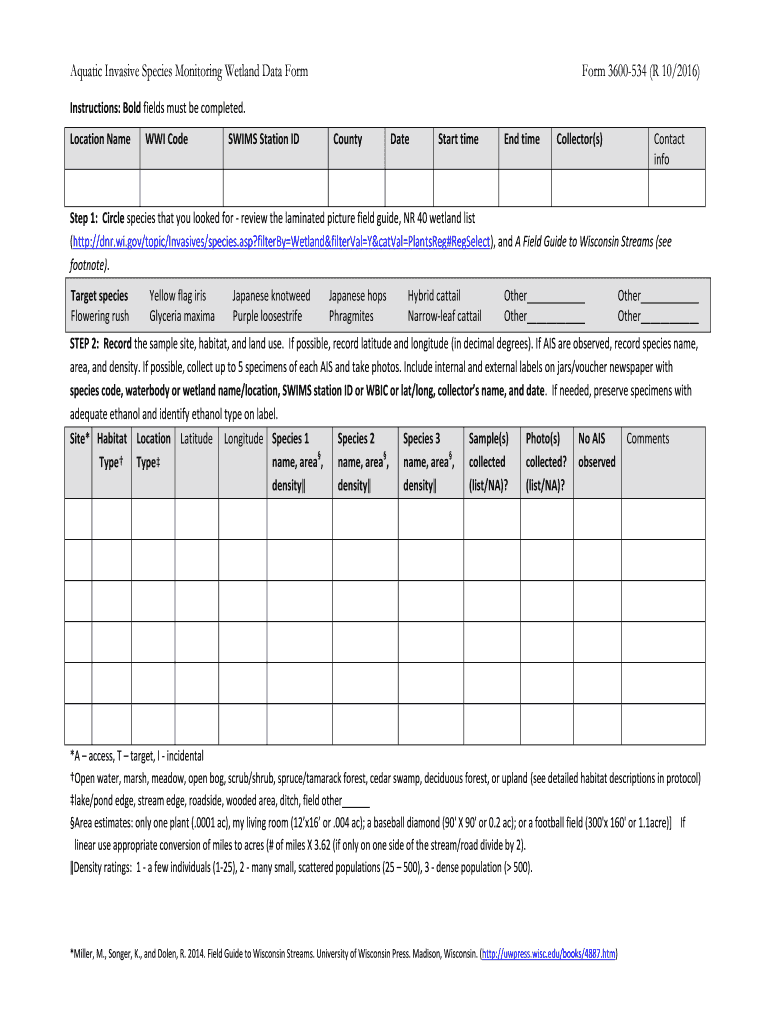 Aquatic Invasive Species Monitoring Wetland Data Former 3600534 (R 10/2016)Instructions: Bold fields must be completed. Location Name WWI CodeSWIMS Station IDCountyDateStart timed timeCollector(s)Contact
