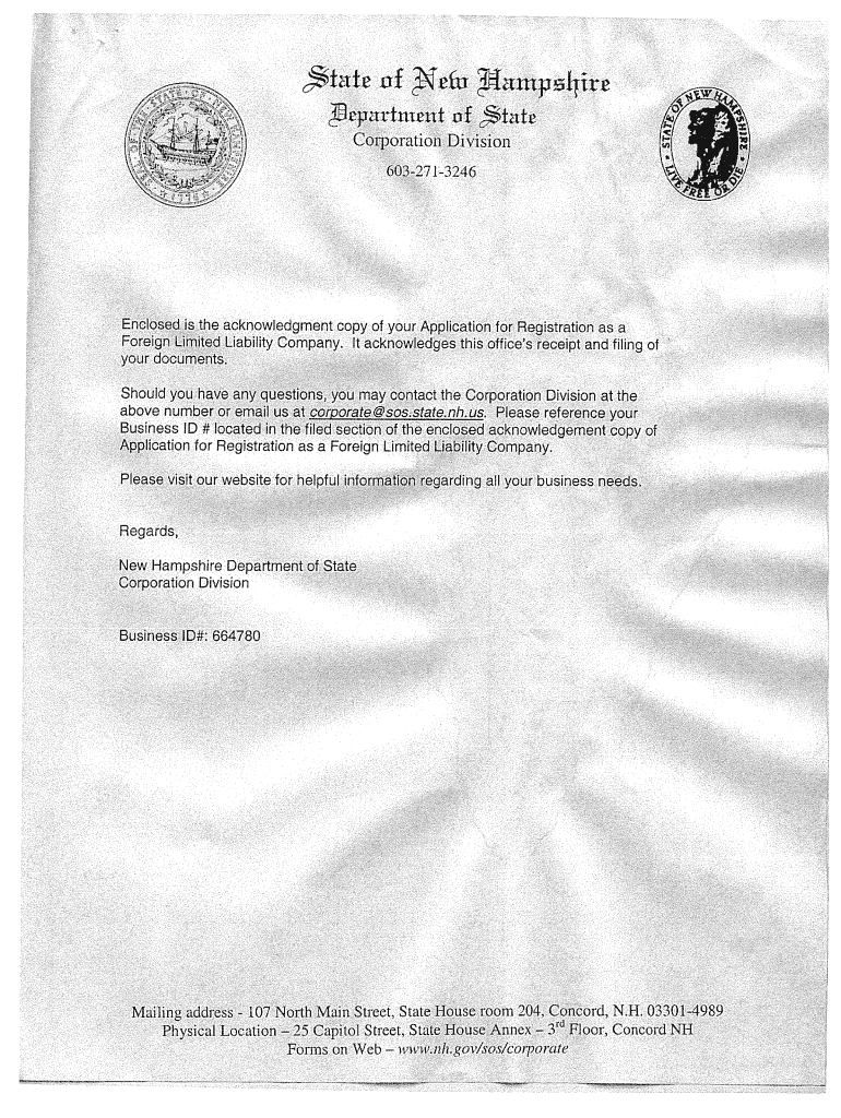ITT ugh 1u rnp4fr l2ptrtnunt ugh It Corporation Division 6032713246Enclosed is the acknowledgment copy of your Application for Registration as a Foreign Limited Liability Company. It acknowledges