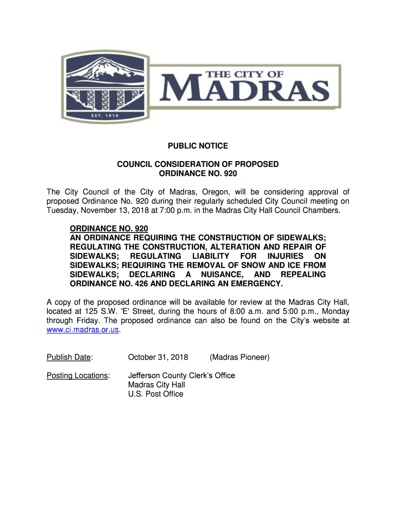 The City Council of the City of Madras, Oregon, will be considering approval of