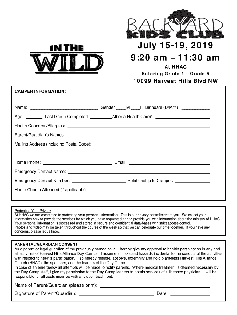July 1519, 2019 9:20 am 11:30 am At HAC Entering Grade 1 Grade 510099 Harvest Hills Blvd NW CAMPER INFORMATION:Name: Age:Gender Last Grade Completed:MF Birthdate (D/M/Y):Alberta Health Care#:Health