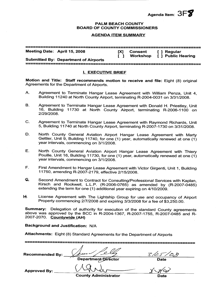 Agenda Item:3FfPALM BEACH COUNTY BOARD OF COUNTY COMMISSIONERS AGENDA ITEM SUMMARY Meeting Date: April 15, 2008, X Consent Regular Workshop Public HearingSubmitted By: Department of Airports. EXECUTIVE