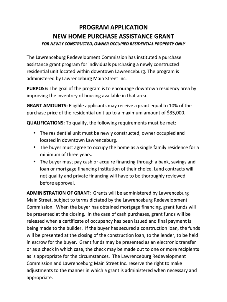 PROGRAMAPPLICATION NEWHOMEPURCHASEASSISTANCEGRANT FORNEWLYCONSTRUCTED, OWNEROCCUPIEDRESIDENTIALPROPERTYONLY TheLawrenceburgRedevelopmentCommissionhasinstitutedapurchase assistancegrantprogramforindividualspurchasinganewlyconstructed