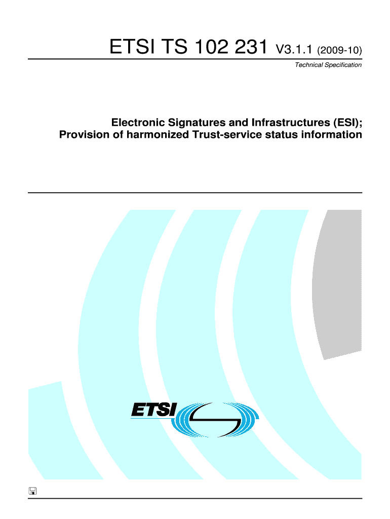 ETS ITS 102 231 V3.1.1 (200910) Technical SpecificationElectronic Signatures and Infrastructures (ESI); Provision of harmonized Trust service status information2ETSI TS 102 231 V3.1.1 (200910)Reference