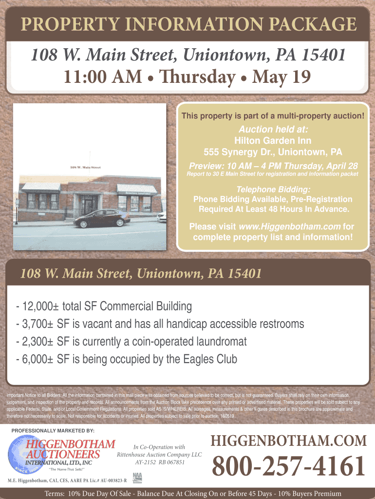 PROPERTY INFORMATION PACKAGE 108 W. Main Street, Uniontown, PA 1540111:00 AM Thursday May 19This property is part of a multi property auction! Auction held at: Hilton Garden Inn 555 Synergy Dr., Uniontown,