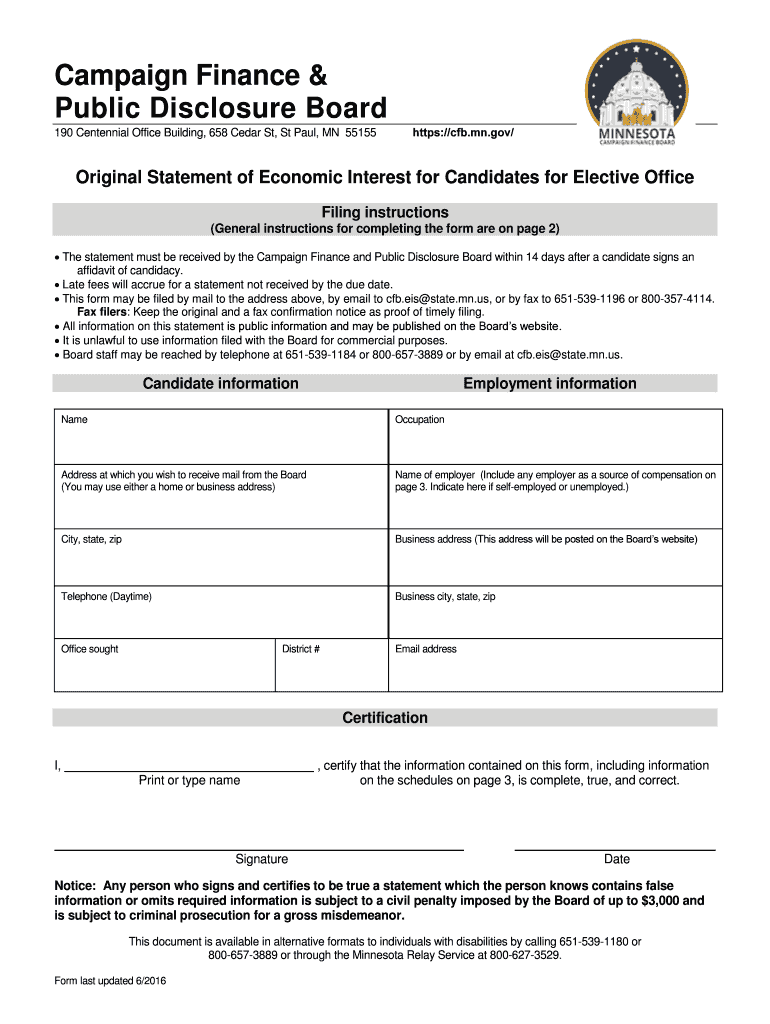 MinnesotaCampaign Finance and Public Disclosure Board 190 Centennial Building. 658 Cedar Street. St. Paul, MN 551551603 FAX: 6515391196 or 8003574114May 29, 2018 Dear Senate Candidate: The forms and