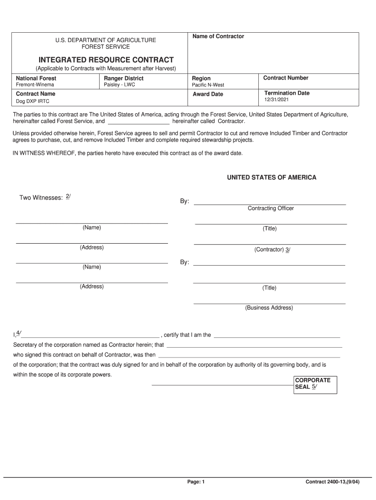 Anil's Revision Name of Contractor. S. DEPARTMENT OF AGRICULTURE FOREST SERVICEINTEGRATED RESOURCE CONTRACT (Applicable to Contracts with Measurement after Harvest) National ForestRanger DistrictRegionFremontWinemaPaisley