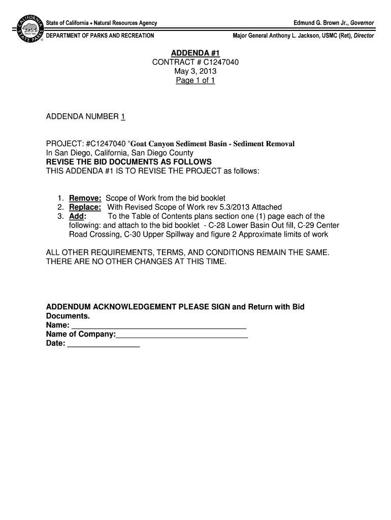 Edmund G. Brown Jr., Governorate of California Natural Resources Agency DEPARTMENT OF PARKS AND RECREATION Major General Anthony L. Jackson, USMC (RET), DirectorADDENDA #1 CONTRACT # C1247040 May