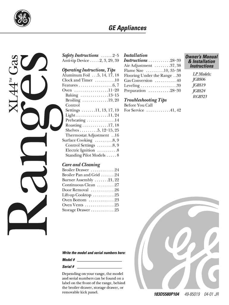 XL44 GasRangesGE AppliancesSafety Instructions. . . . . .25Antitip Device. . . . .2, 3, 29, 39Operating Instructions, Tips Aluminum Foil. . .5, 14, 17, 18 Clock and Timers. . . . . . . . . .10 Features.