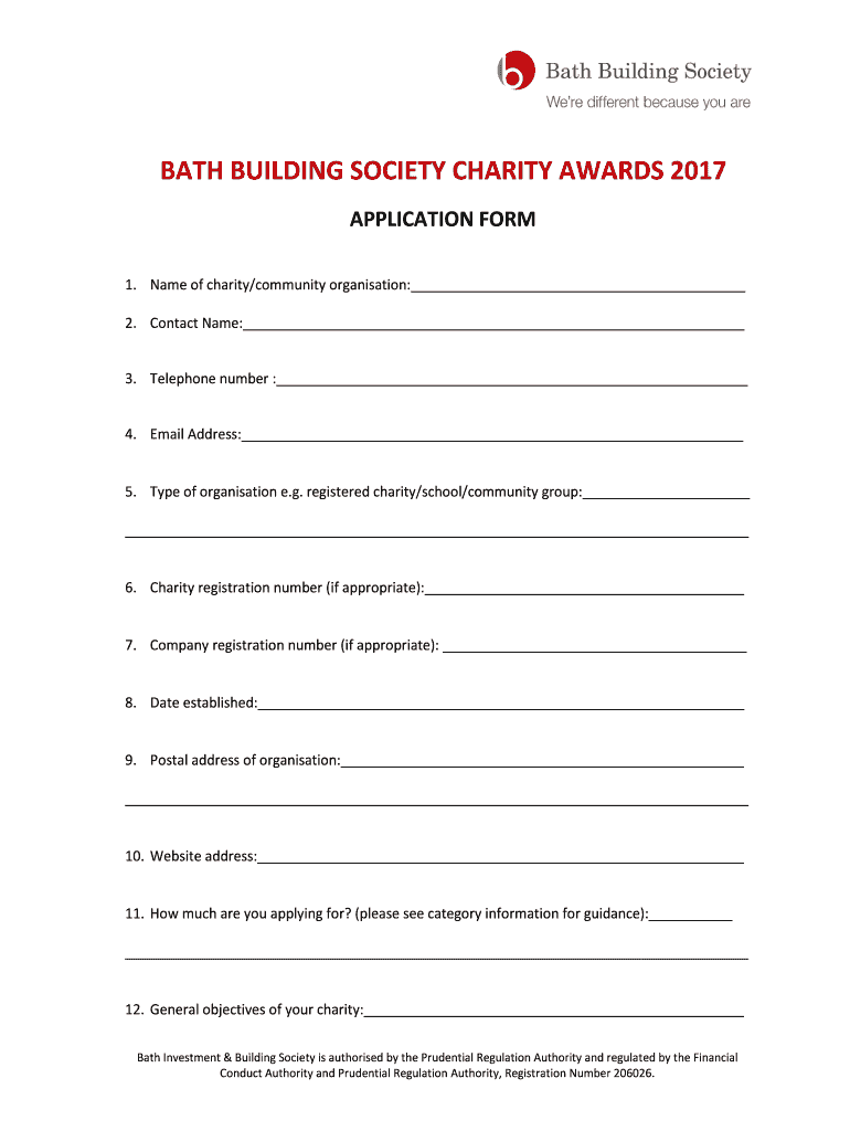 BATH BUILDING SOCIETY CHARITY AWARDS 2017 APPLICATION FORM 1. Name of charity/community organization: 2. Contact Name: 3. Telephone number : 4. Email Address: 5. Type of organization e.g. registered