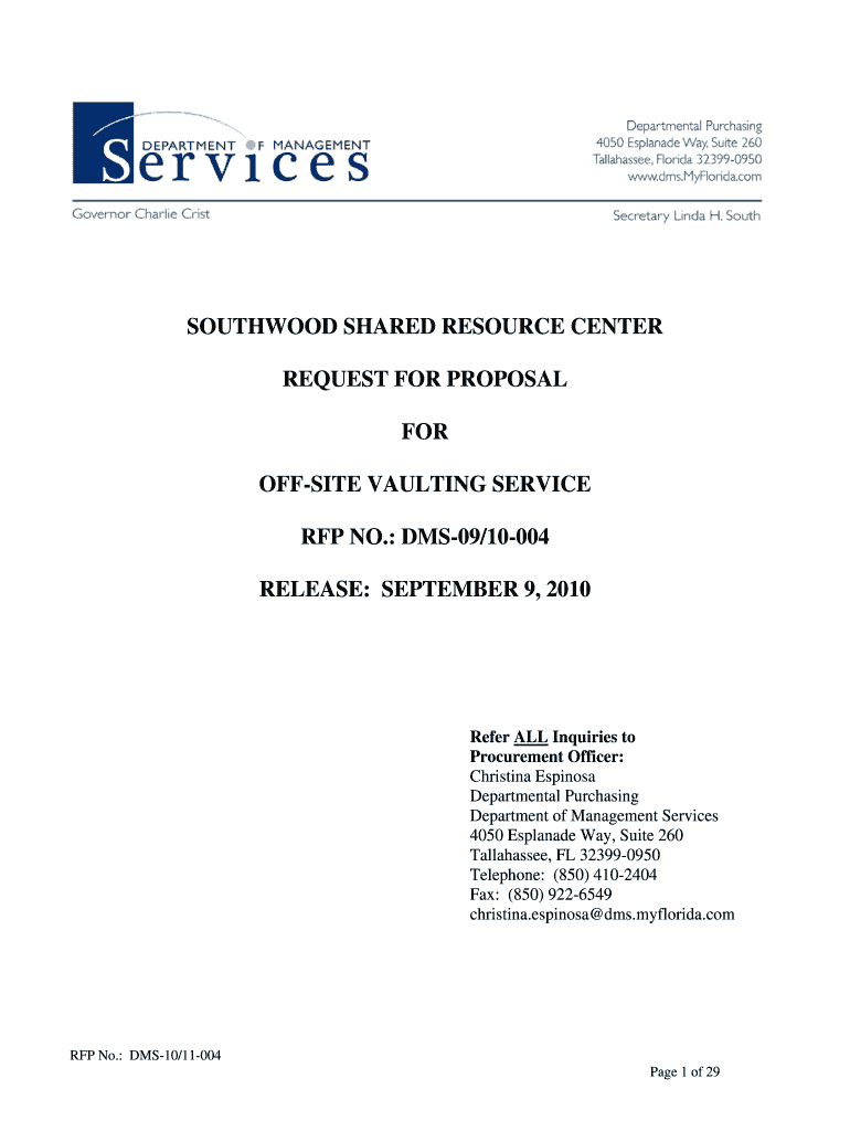 SOUTHWARD SHARED RESOURCE CENTER REQUEST FOR PROPOSAL FOR OFFSITE VAULTING SERVICE RFP NO.: DMS09/10004 RELEASE: SEPTEMBER 9, 2010Refer ALL Inquiries to Procurement Officer: Christina Espinosa Departmental