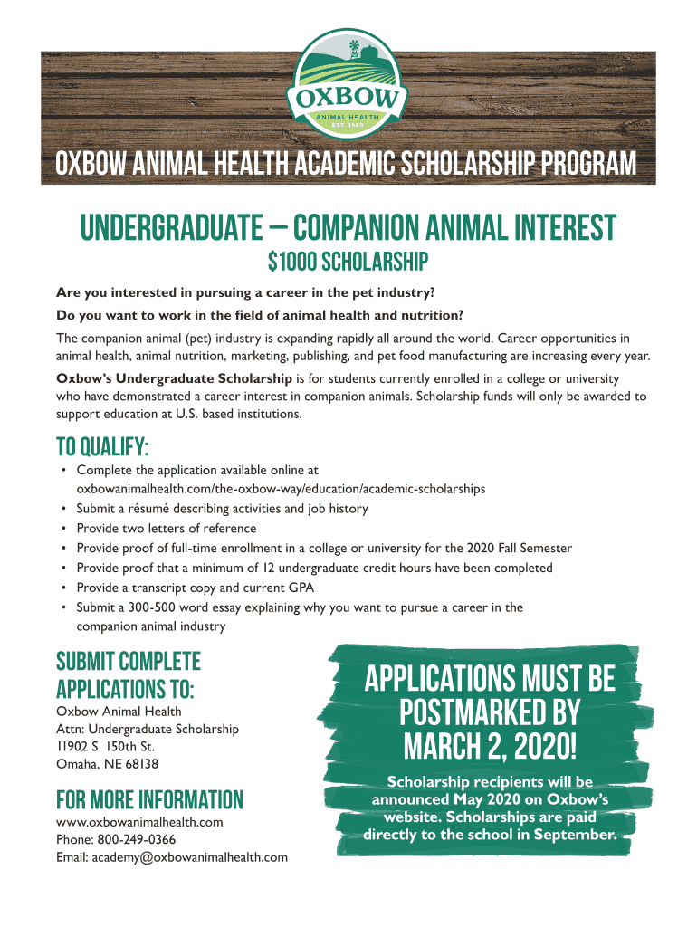 Oxbow Animal Health Academic Scholarship ProgramUndergraduate Companion Animal Interest $1000 Scholarship you interested in pursuing a career in the pet industry? Do you want to work in the field
