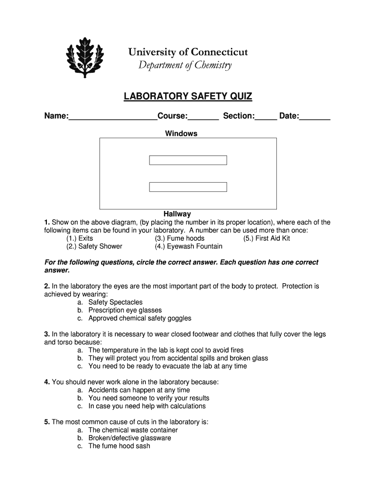University of Connecticut Department of Chemistry LABORATORY SAFETY QUIZ Name: Course: Section: Date: WindowsHallway 1. Show on the above diagram, (by placing the number in its proper location), where
