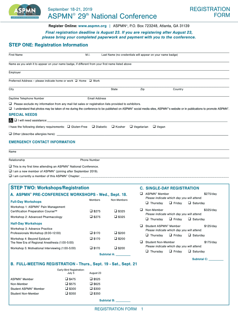 September 1821, 2019ASPMN 29 National Conference registration Preregister Online: www.aspmn.org ASPEN, P.O. Box 723248, Atlanta, GA 31139Final registration deadline is August 23. If you are registering