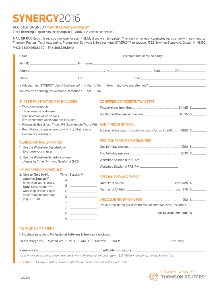 SYNERGY2016 REGISTER ONLINE AT TAX.TR.COM/CSSYNERGY FREE financing: Register online by August 31, 2016 (see website for details). MAIL OR FAX: Copy this registration form for each individual you wish