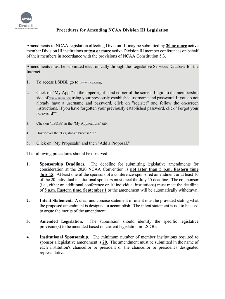 Procedures for Amending NCAA Division III Legislation Amendments to NCAA legislation affecting Division III may be submitted by 20 or more active member Division III institutions or two or more active