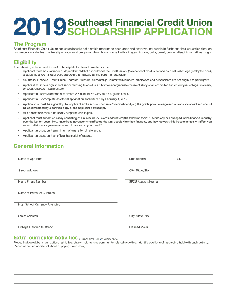 2019SCHOLARSHIP APPLICATION Southeast Financial Credit Unionize Program Southeast Financial Credit Union has established a scholarship program to encourage and assist young people in furthering their