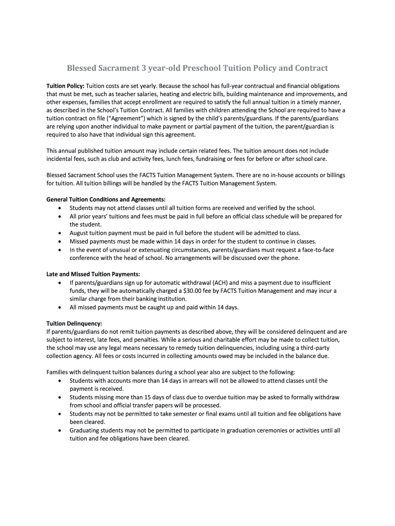 Blessed Sacrament 3-year-old Preschool Tuition Policy and Contract