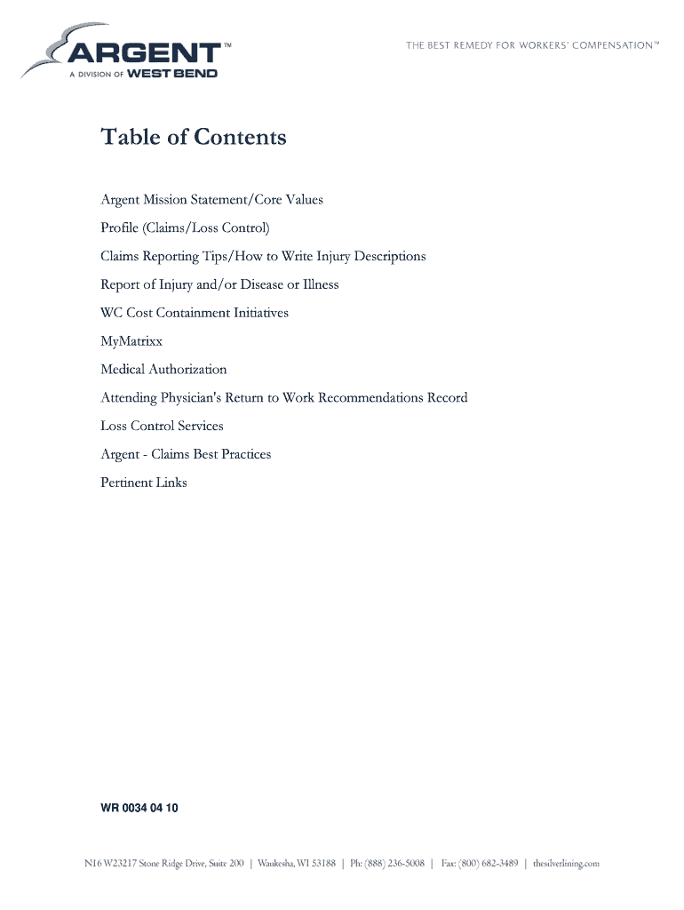Table of Contents Argent Mission Statement/Core Values Profile (Claims/Loss Control) Claims Reporting Tips/How to Write Injury Descriptions Report of Injury and/or Disease or Illness WC Cost Containment