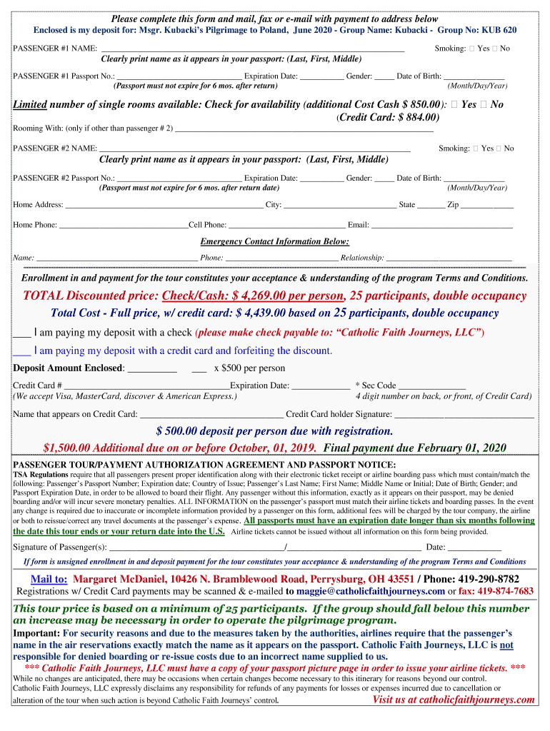 Please complete this form and mail, fax or email with payment to address below Enclosed is my deposit for: Msgr. Backs Pilgrimage to Poland, June 2020 Group Name: Back Group No: PUB 620 PASSENGER