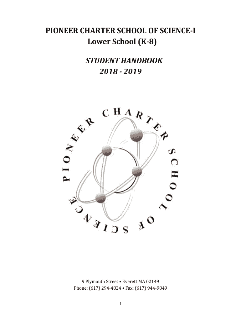 PIONEER CHARTER SCHOOL OF SCIENCE Lower School (K8) STUDENT HANDBOOK 2018 20199 Plymouth Street Everett MA 02149 Phone: (617) 2944824 Fax: (617) 9449849 1TABLE OF CONTENTS Welcome ... Mission Statement,
