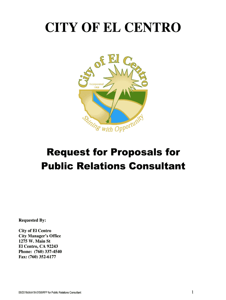 CITY OF EL CENTRORequest for Proposals for Public Relations ConsultantRequested By: City of El CENTR City Managers Office 1275 W. Main St El CENTR, CA 92243 Phone: (760) 3374540 Fax: (760) 352617706/2018cfoA180158RFP